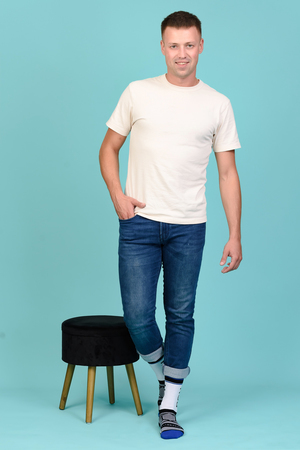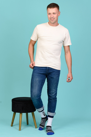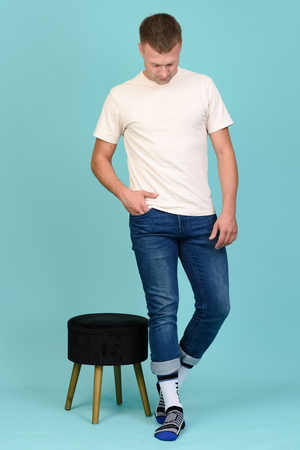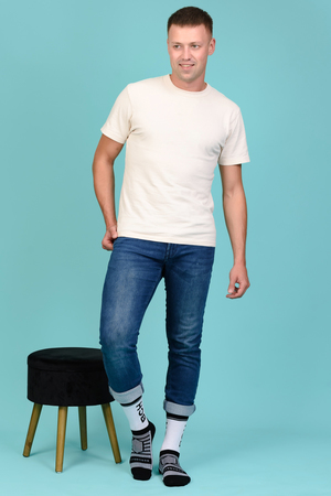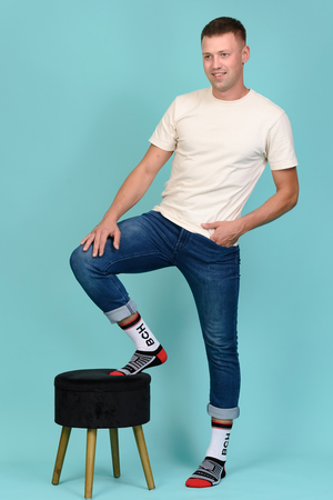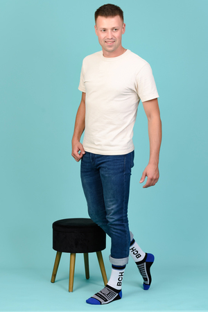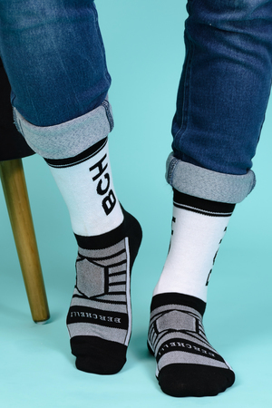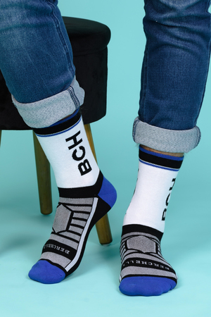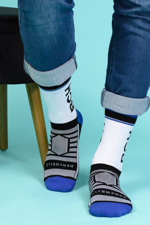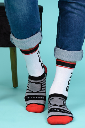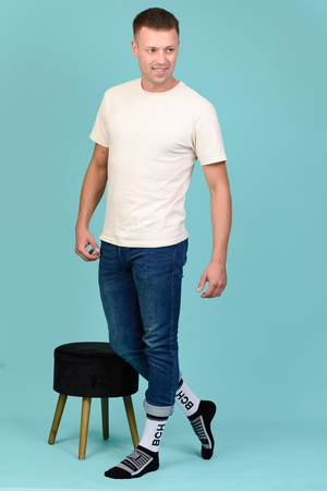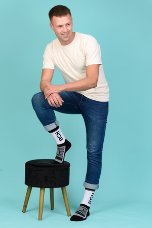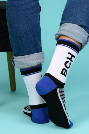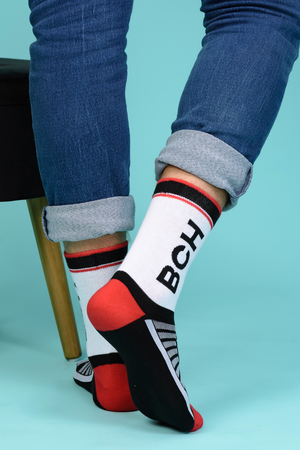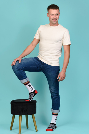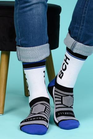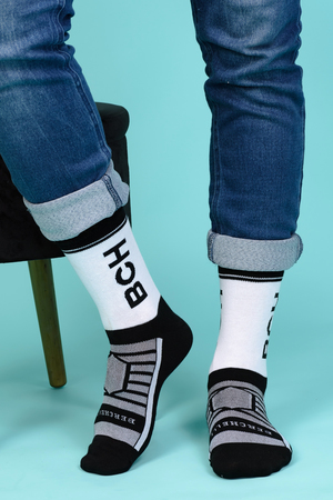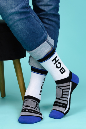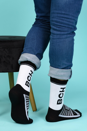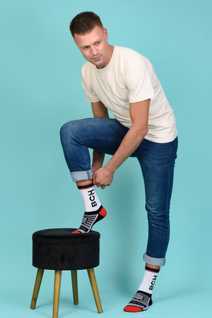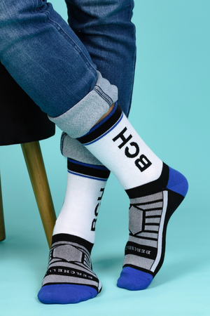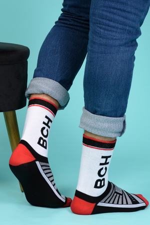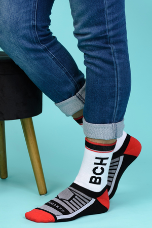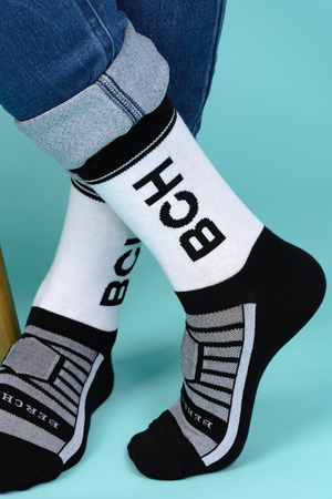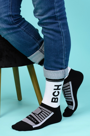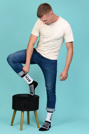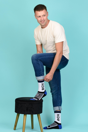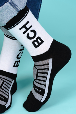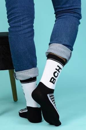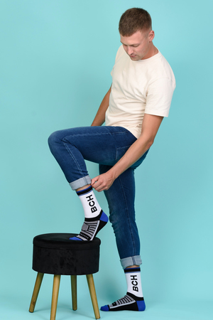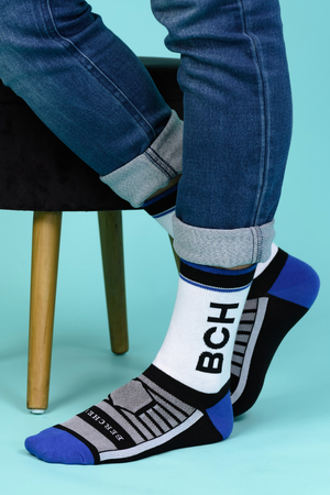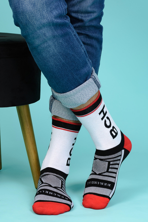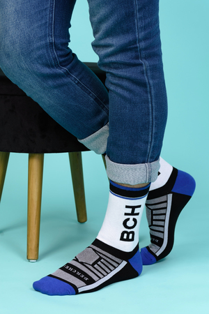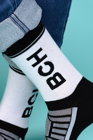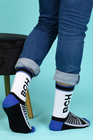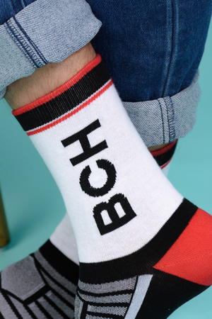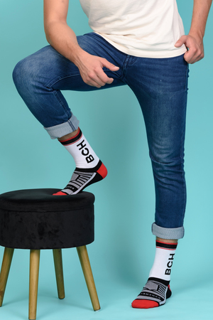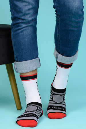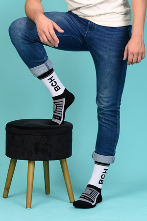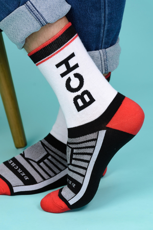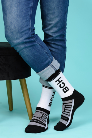 Набор высоких мужских носков в спортивном стиле. Спереди вывязана фирменная надпись, по всему носку контрастные вставки. В упаковке 3 пары - по 1 паре каждой расцветки