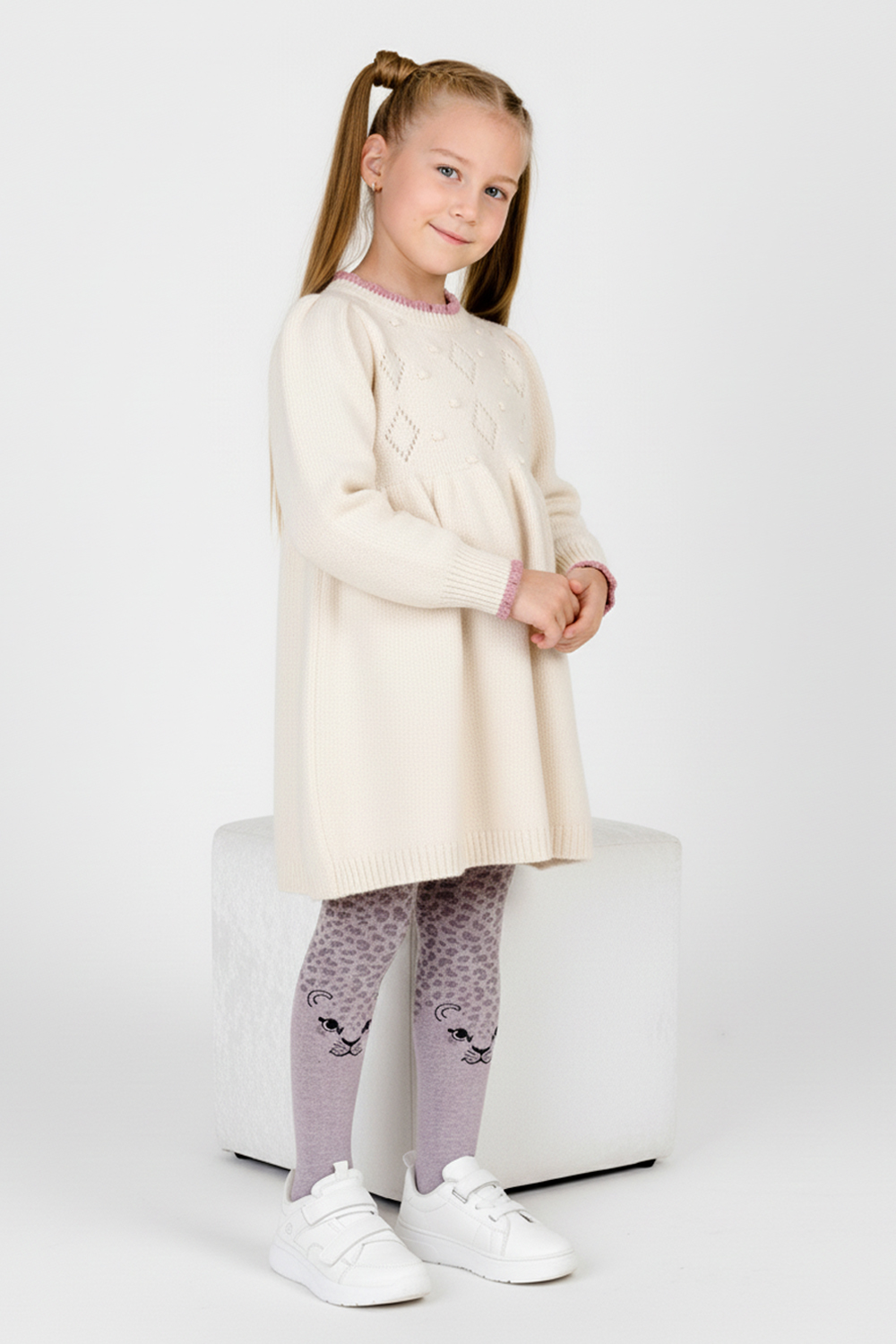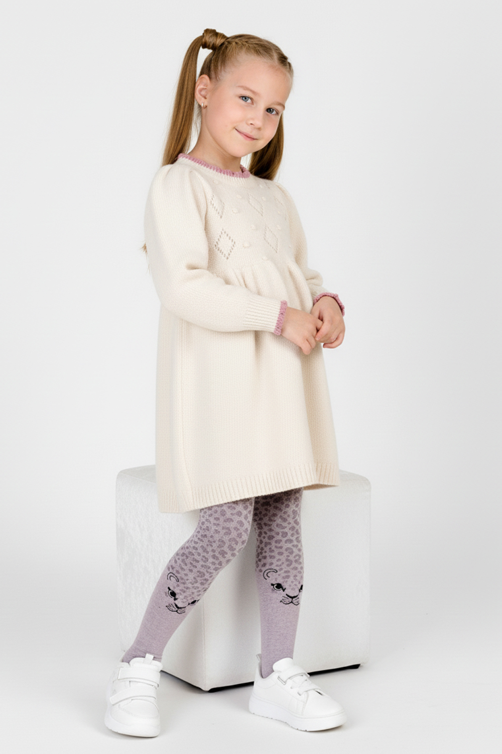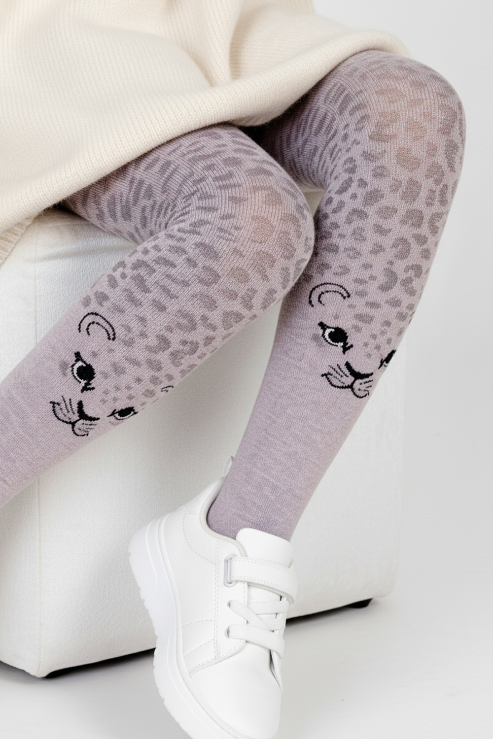 Детские колготки для девочек. Ниже колена кошачья мордочка. Узор в виде пятен леопарда.