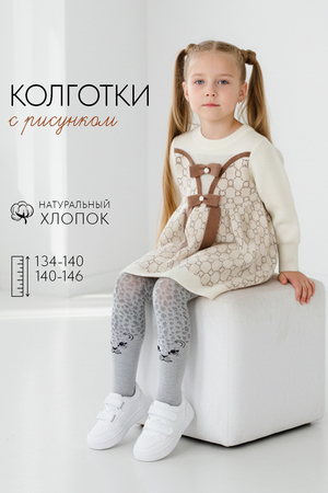 Детские колготки для девочек. Ниже колена кошачья мордочка. Узор в виде пятен леопарда.