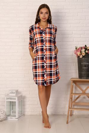 Халат полуприлегающего силуэта с рукавом 3/4 на манжете, с воротником, карманами, планкой-застежкой на пуговицах. Длина изделия до колена.