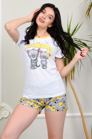Пижама с шортами на каждый день. Свободные шортики с карманами, на талии заложены по две мягкие складки с каждой стороны. Футболка из мягкого трикотажа, милый мимишный принт
