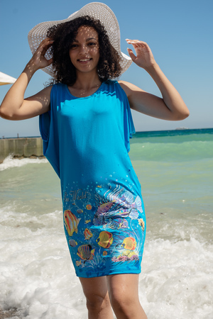 Свободная туника из вискозы. Принт в виде тропических рыбок, длина до середины бедра, рукава отсутствуют.