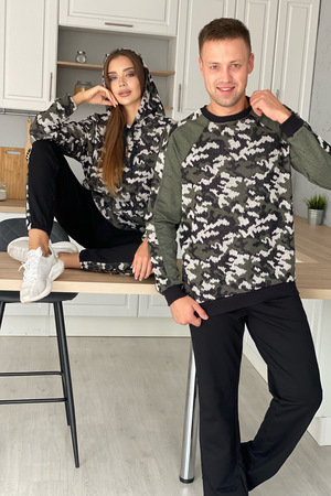 Толстовка мужская прямого силуэта, слегка заниженная к низу. Рукав реглан, из футера меланж с лампасом из основной ткани. Обтачка горловины, манжета рукава и низ изделия из кашкорсе.