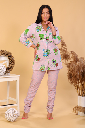 Пижама женская теплая с оригинальным дизайнерским принтом. Футболка с длинным рукавом, воротником рубашечного типа на пуговицах. Брюки прямого кроя, с карманами, пояс на резинке.