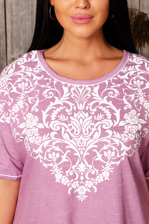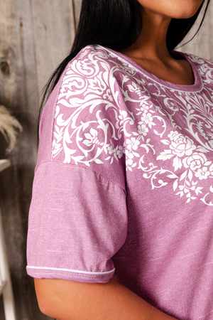 Туника прямого силуэта, с округлой горловиной, с разрезами в нижней части боковых швов. Горловина и низ рукавов обработаны бейкой из основного полотна.