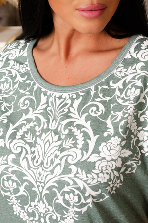 Туника прямого силуэта, с округлой горловиной, с разрезами в нижней части боковых швов. Горловина и низ рукавов обработаны бейкой из основного полотна.