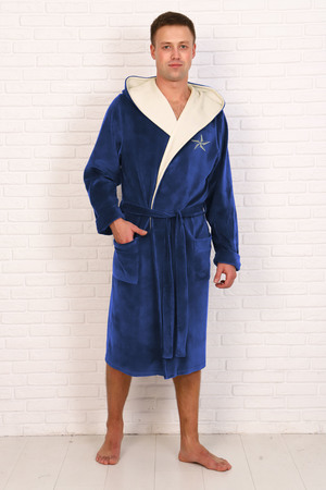 Мужской домашний халат из велюровой ткани, с капюшоном. Внутренняя часть капюшона контрастного цвета. На рукаве и груди халата оригинальная вышивка в цвет отделки капюшона. С накладными карманами, на рукавах манжеты. Халат фиксируется поясом.