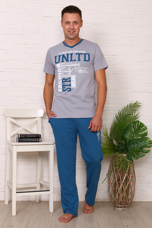Костюм домашний: футболка и брюки. Футболка с оригинальным принтом, V-образный вырез, короткий втачной рукав. Прямые брюки с карманами. Покрой изделия обеспечивает свободу движения, а материалы прекрасно пропускают воздух и очень приятны к телу.