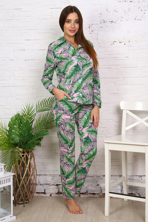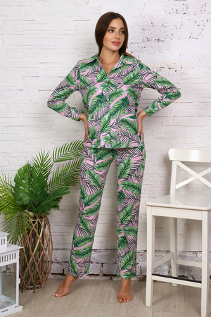 Женская трикотажная пижама из 100% хлопка, кулирная гладь. Комплект из рубашки с длинным рукавом на пуговицах и брюк с карманами. Стильный домашний лук. Удобный комплект, приятный на ощупь, дышащий. Пижама не сковывает движений, комфортна и приятна к телу. Пижама отлично сидит на фигурах разных типов.