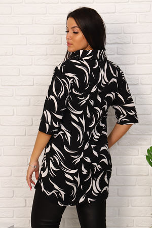 Легкая туника прямого покроя, рукава 3\4 на манжете. Воротник отложной, на полочке планка, украшенная декоративными пуговицами.