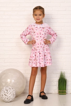 Повседневное платье в детский садик для девочек дошкольного и младшего школьного возраста, из трикотажного полотна интерлок с рисунком. Платье трапециевидного силуэта, с широкими отрезными воланами спереди и сзади, с втачным длинным рукавом на резинке по низу, с застежкой на петлю и пуговицу на спинке. Воланы собраны на сборку. Спинка со средним швом. Рукав одношовный. Срез горловины окантован. Низа рукавов и изделия подогнуты. На передней части прикреплен декоративный элемент.