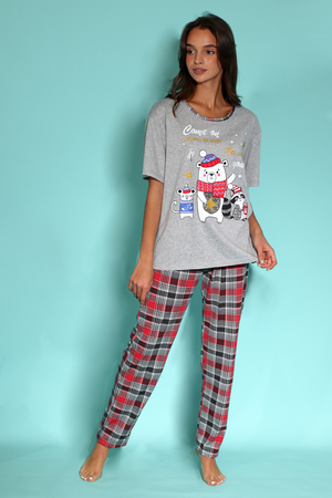 Пижама состоит из футболки и брюки. Футболка свободного кроя из ткани меланж, короткий рукав на спущенном плече, с новогодним принтом. Свободные брюки на резинке.