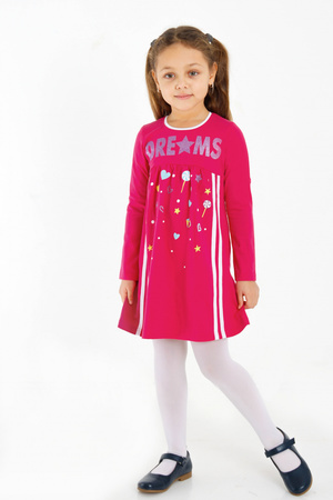 Платье из натуральной хлопковой ткани кулирки. Силуэт расширен к низу, спереди подрез по линии груди, юбка на сборке, по вертикали настрочены лампасы отделочного цвета, рукав втачной длинный, по горловине узкая бейка из рибаны. На полочке модный принт.