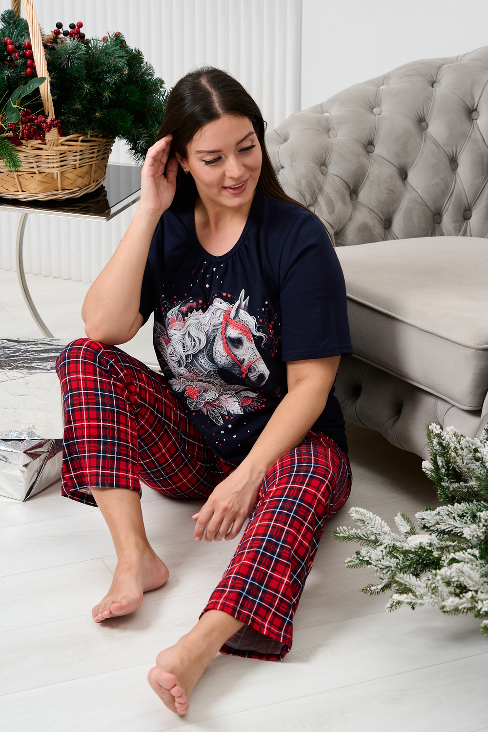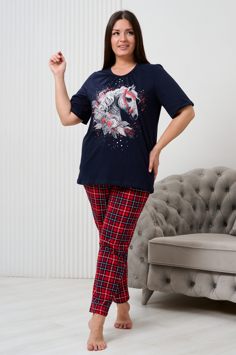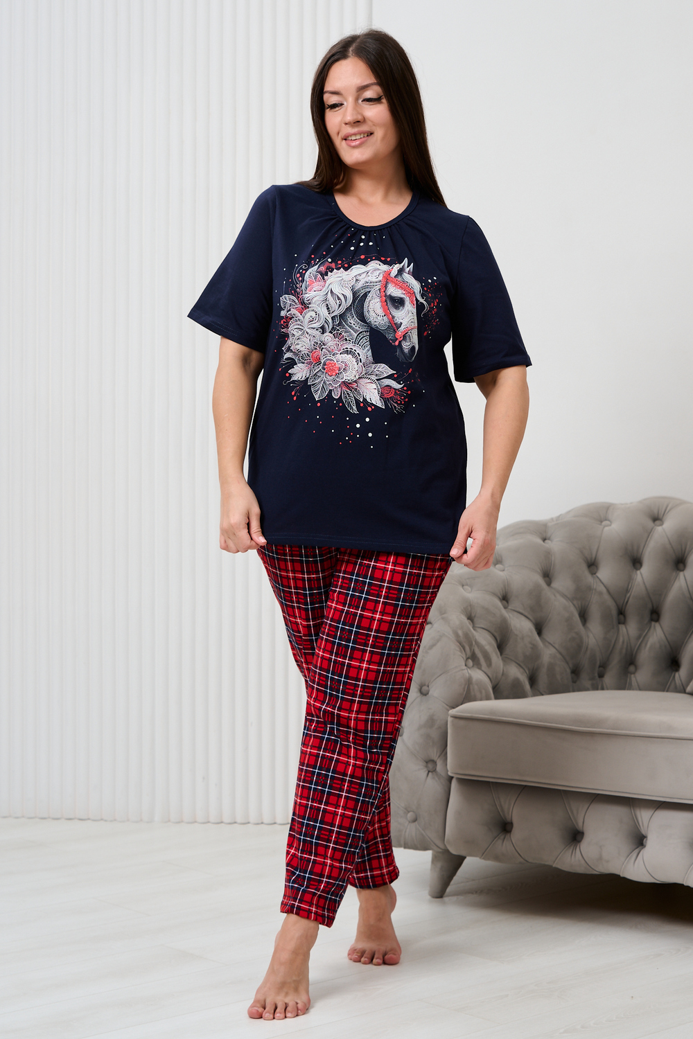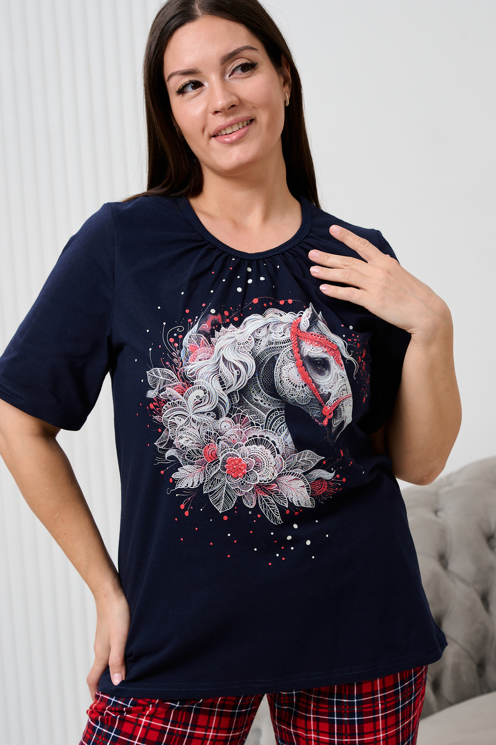 Костюм женский домашний: футболка с брюками. Футболка прямого силуэта с втачным коротким рукавом. На полочке новогодний принт. Брюки полуприлегающего силуэта с внутренними карманами на передних половинках брюк.