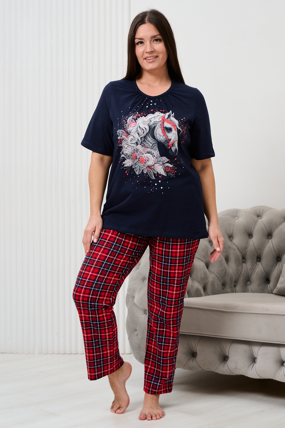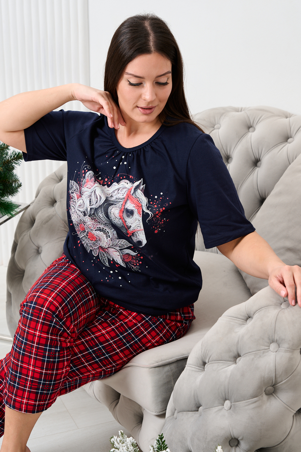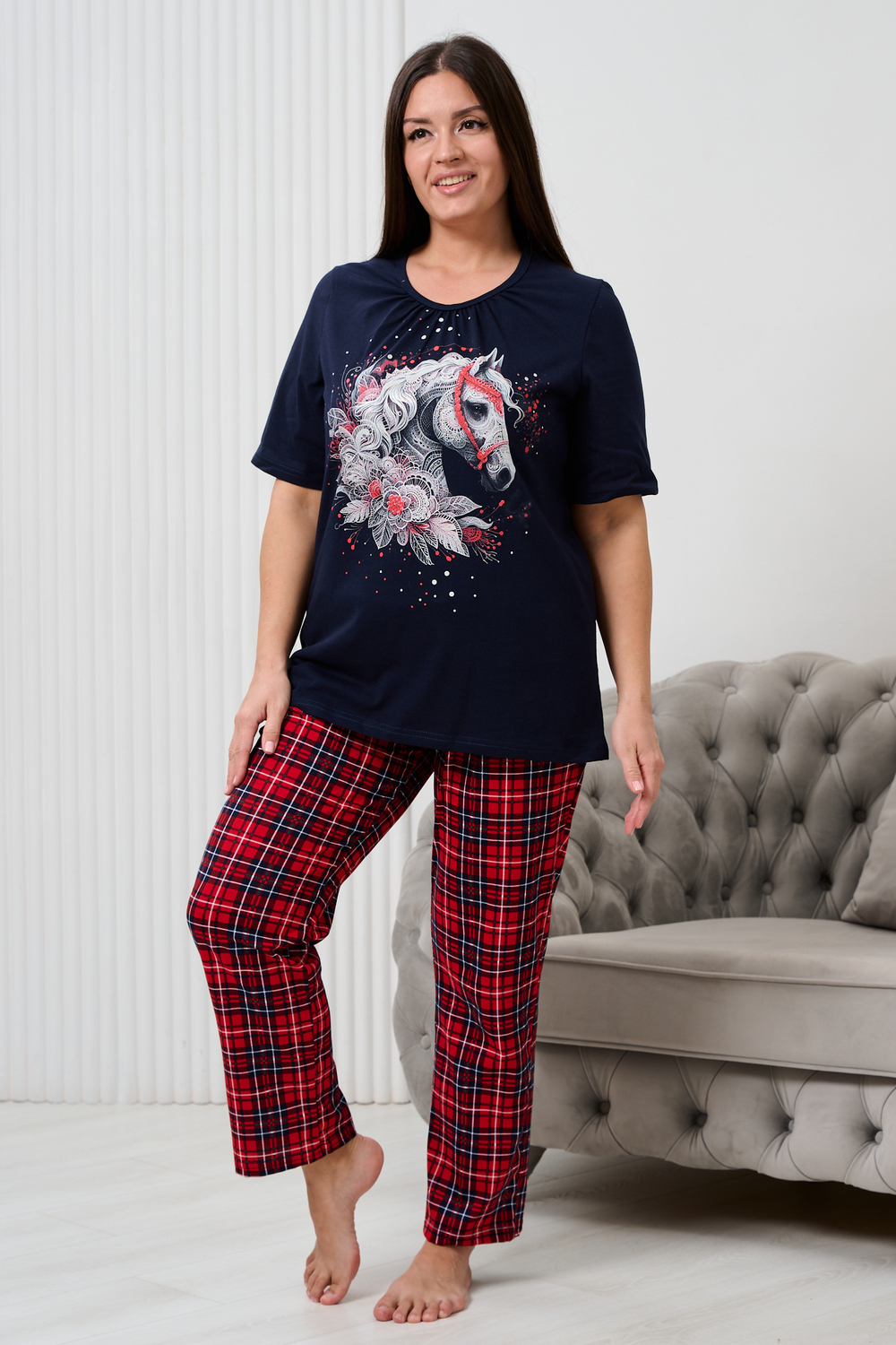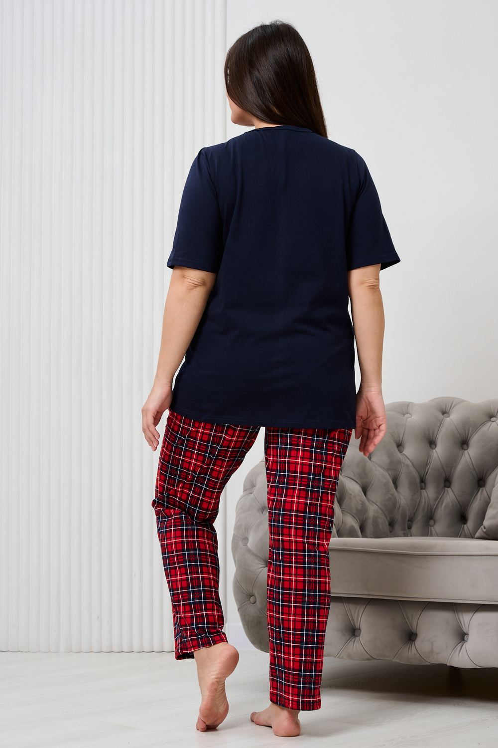 Костюм женский домашний: футболка с брюками. Футболка прямого силуэта с втачным коротким рукавом. На полочке новогодний принт. Брюки полуприлегающего силуэта с внутренними карманами на передних половинках брюк.