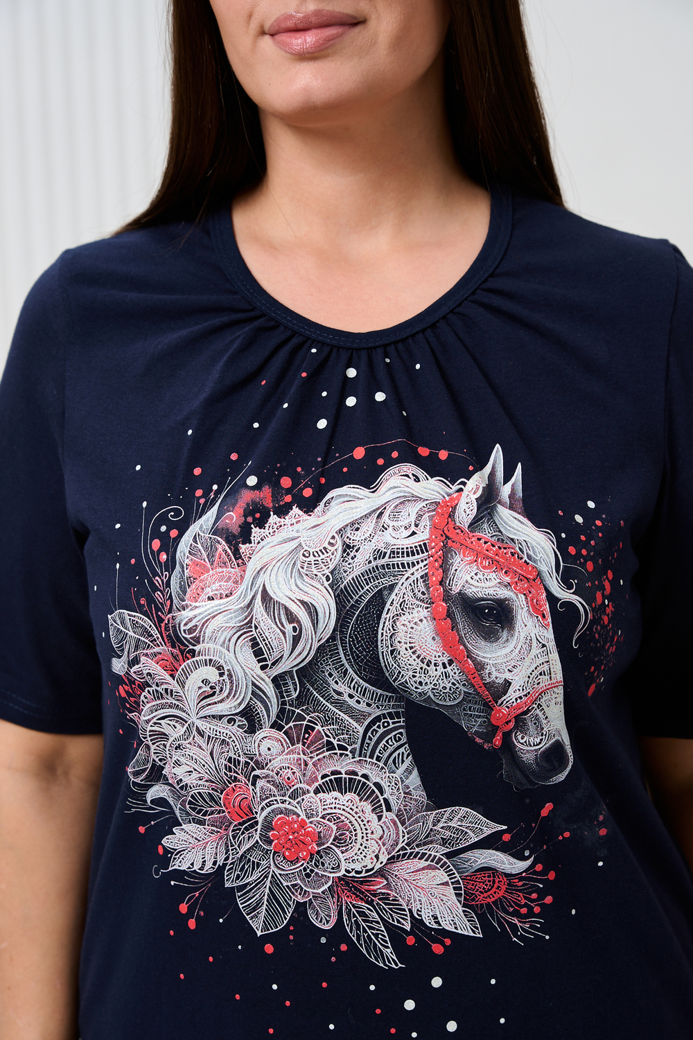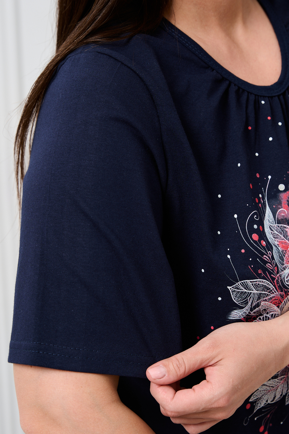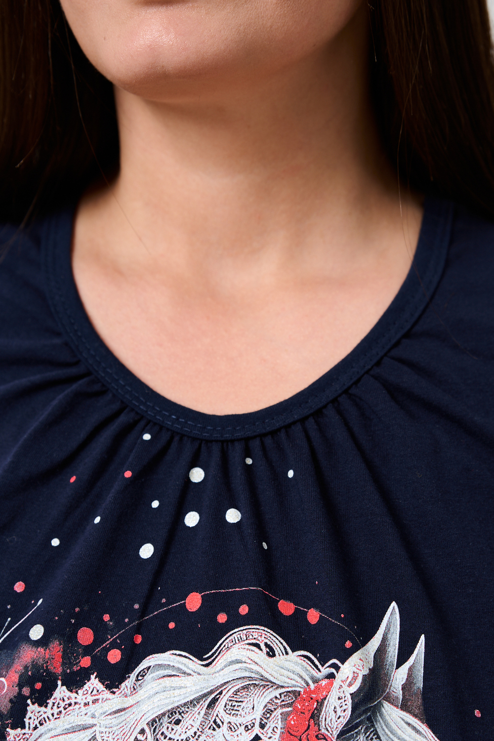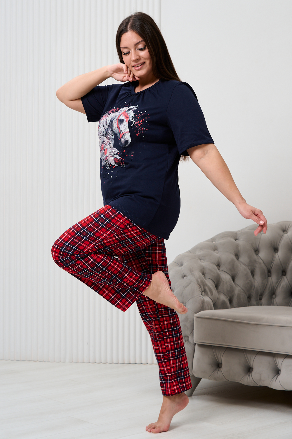 Костюм женский домашний: футболка с брюками. Футболка прямого силуэта с втачным коротким рукавом. На полочке новогодний принт. Брюки полуприлегающего силуэта с внутренними карманами на передних половинках брюк.
