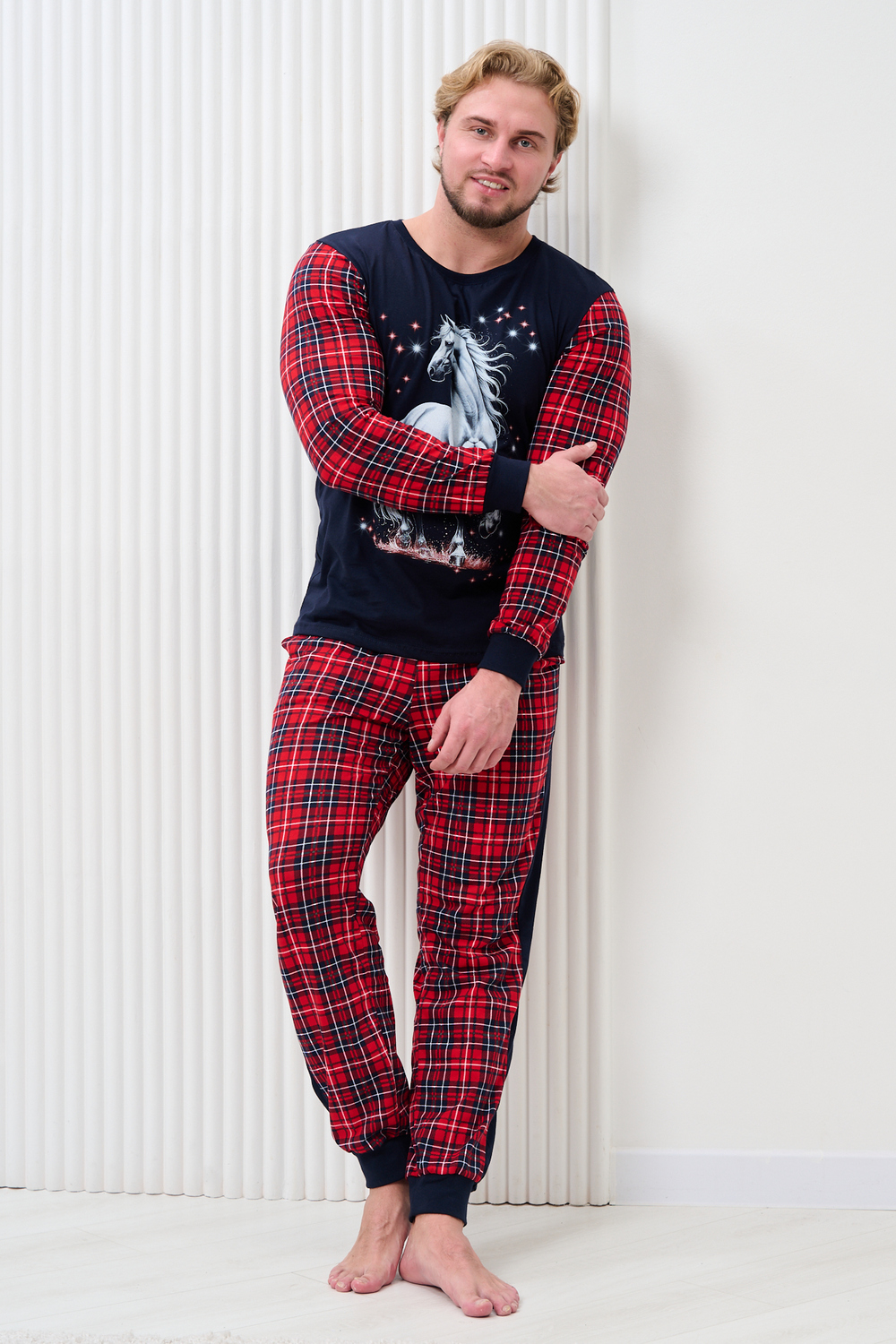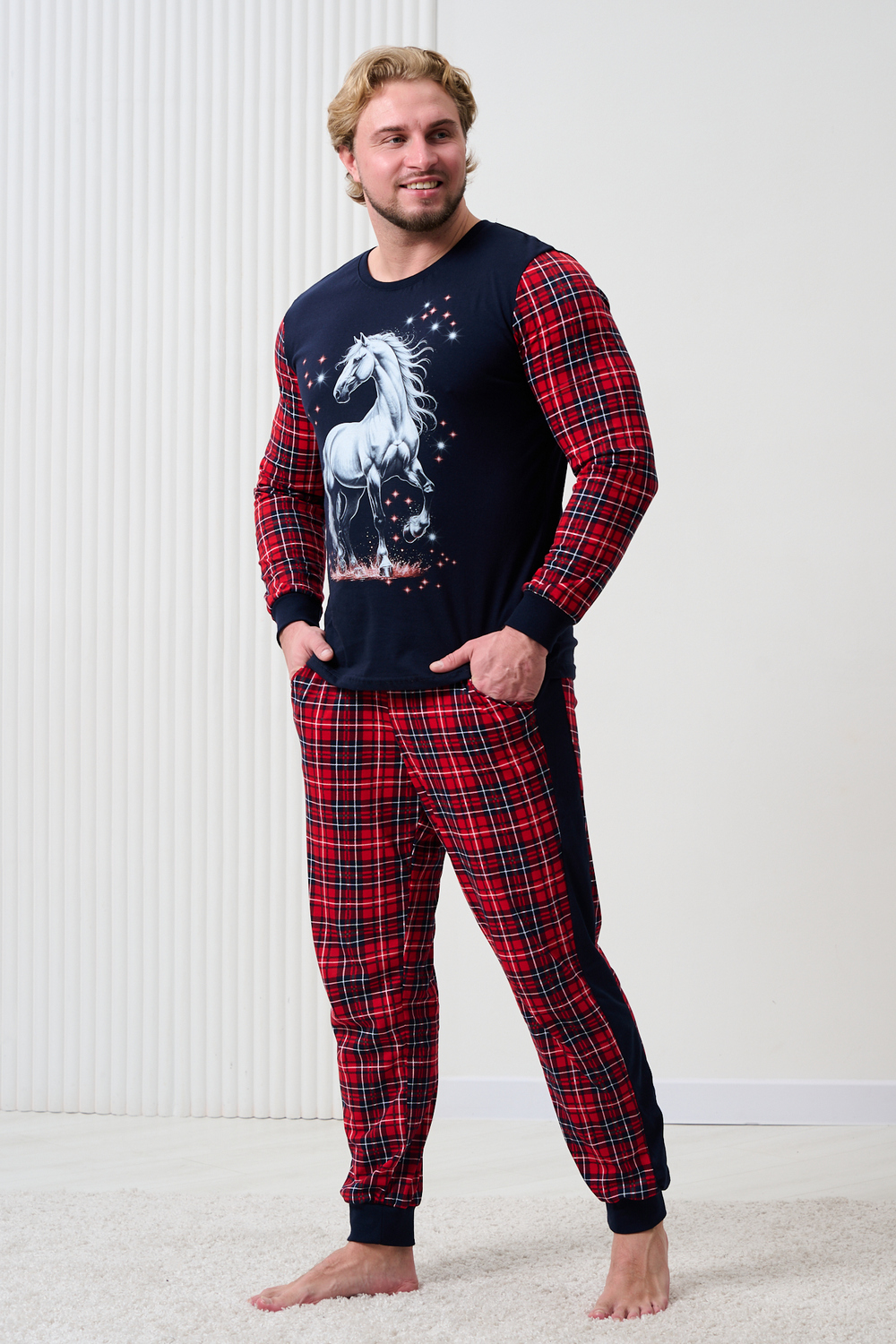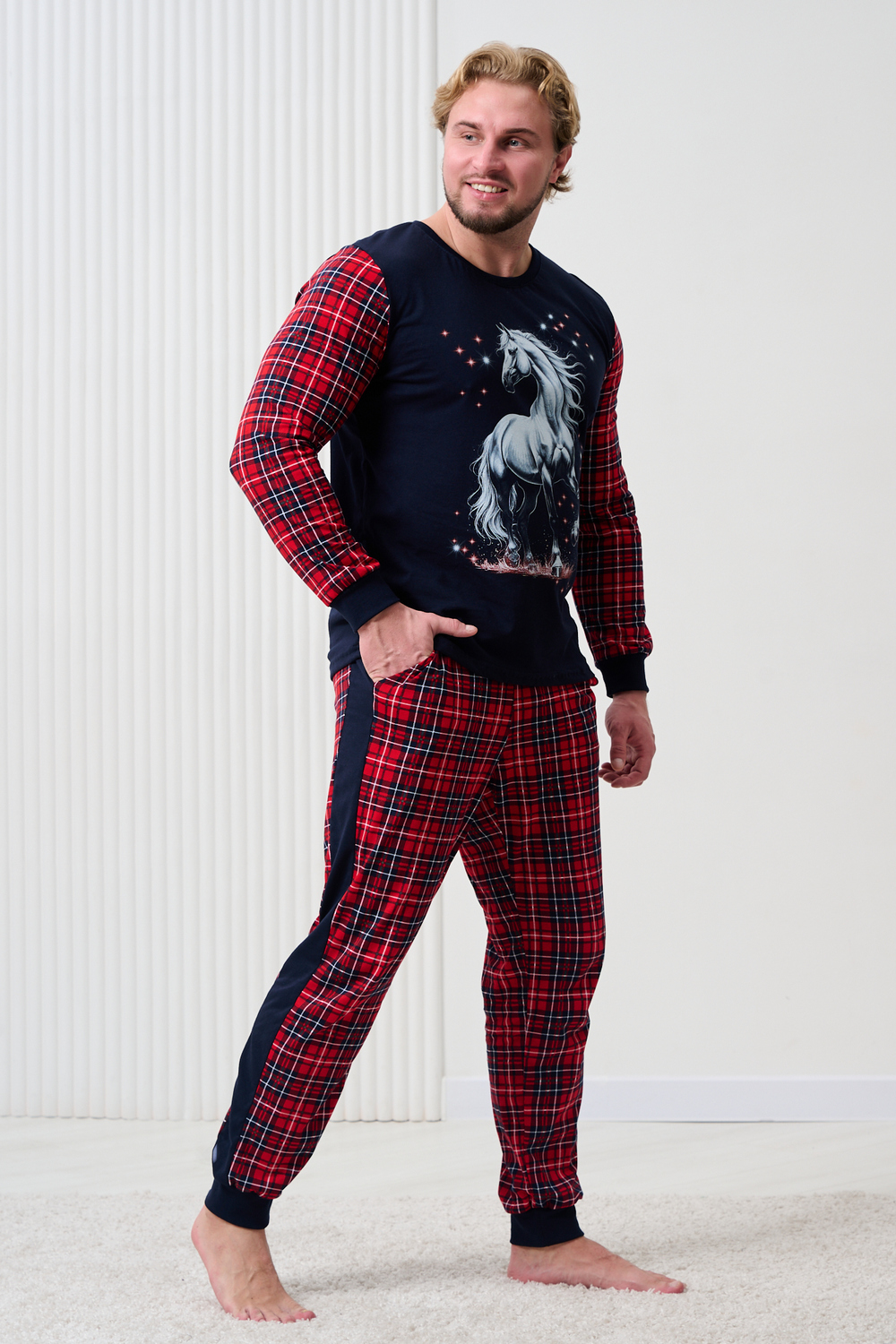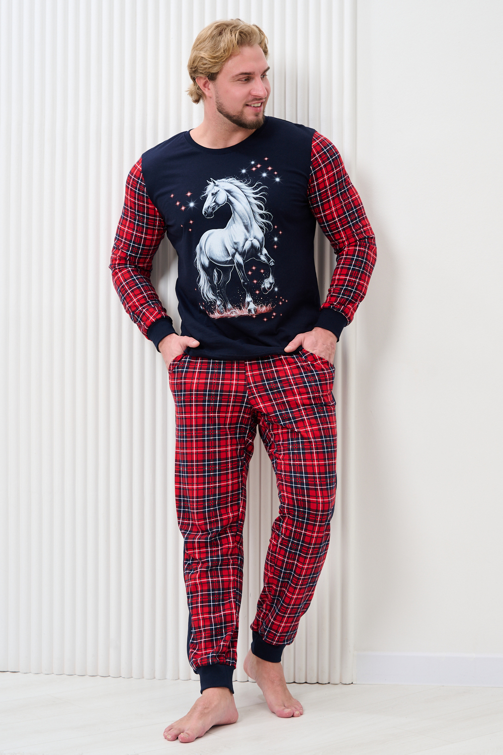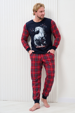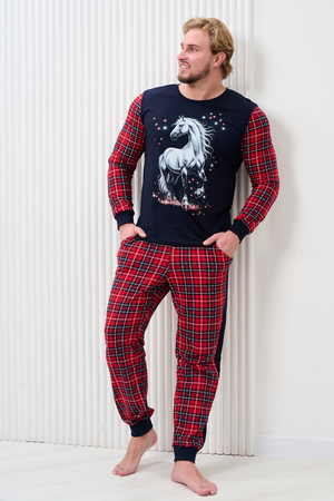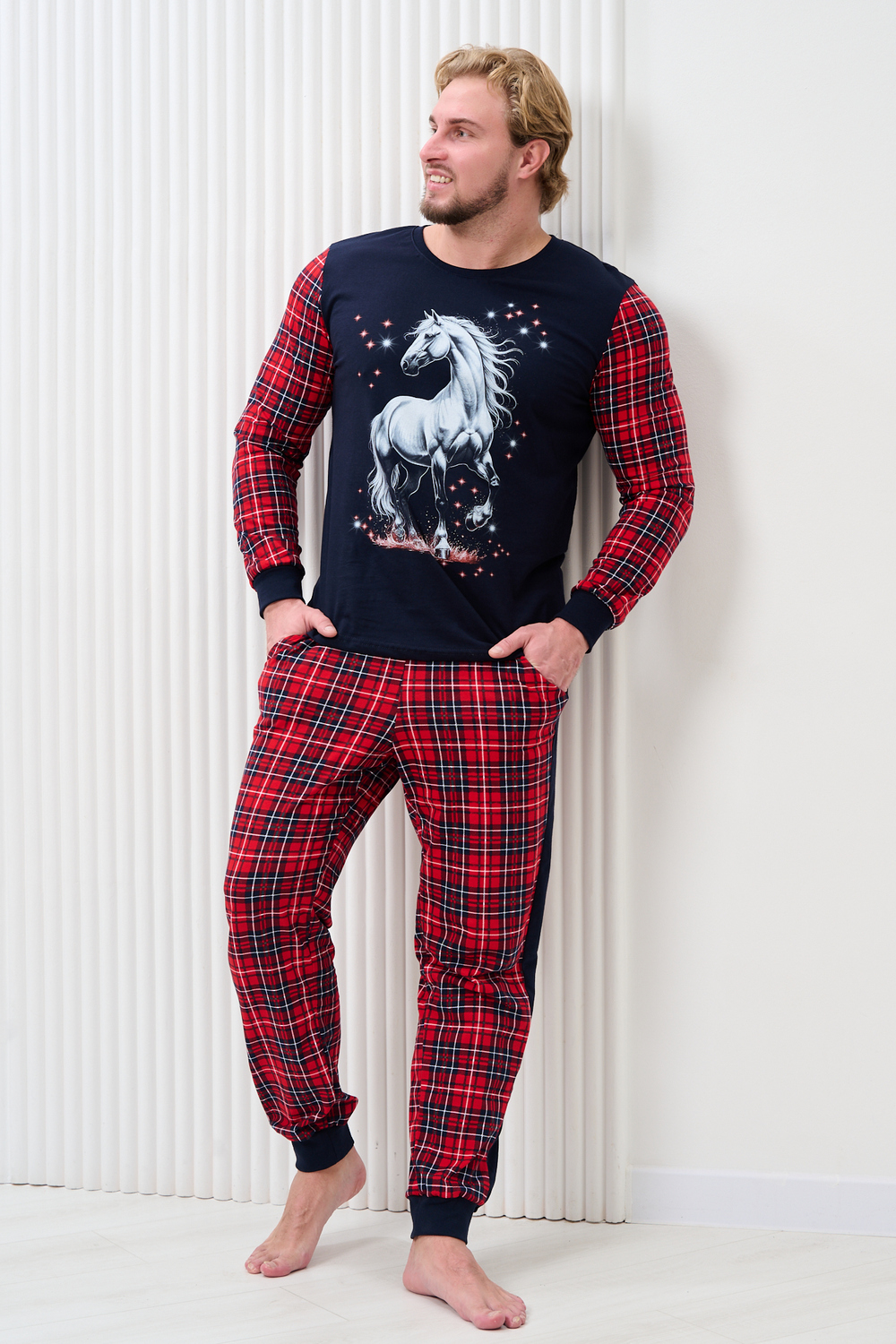 Пижама мужская свободного силуэта состоит из кофты и брюк. На полочке принт. Брюки на манжете. В боковых швах карманы.