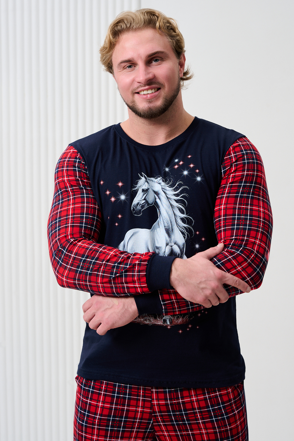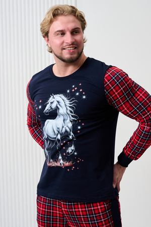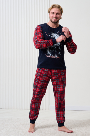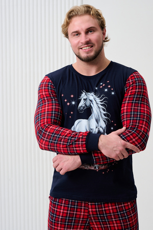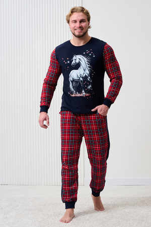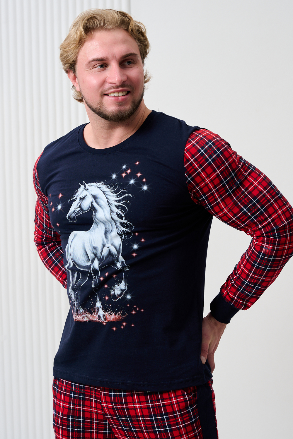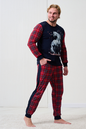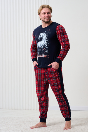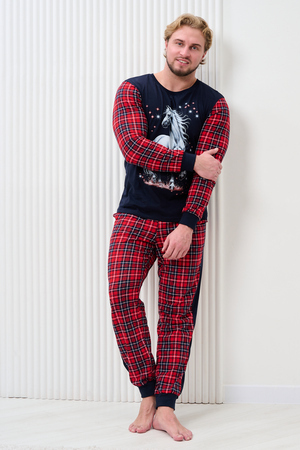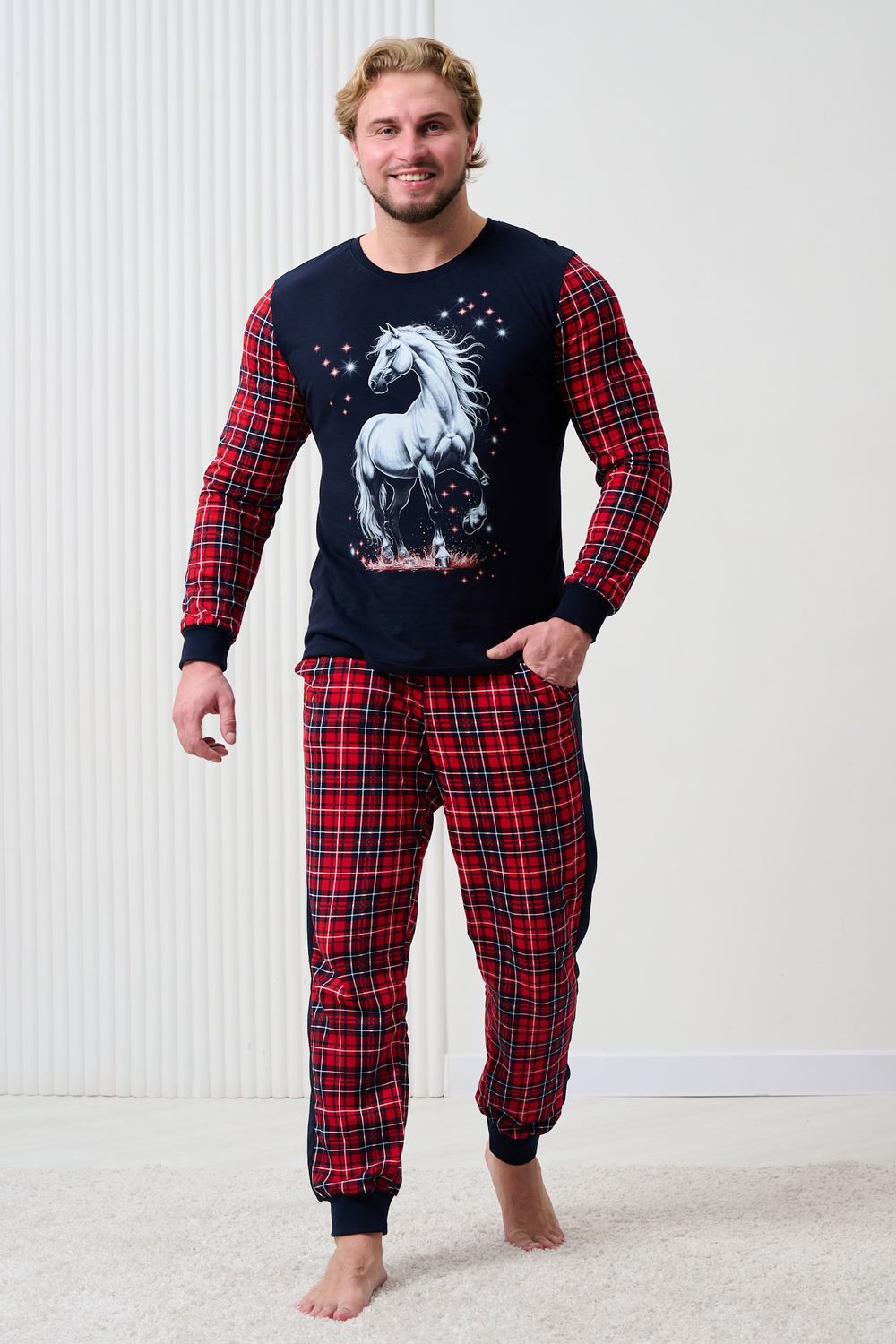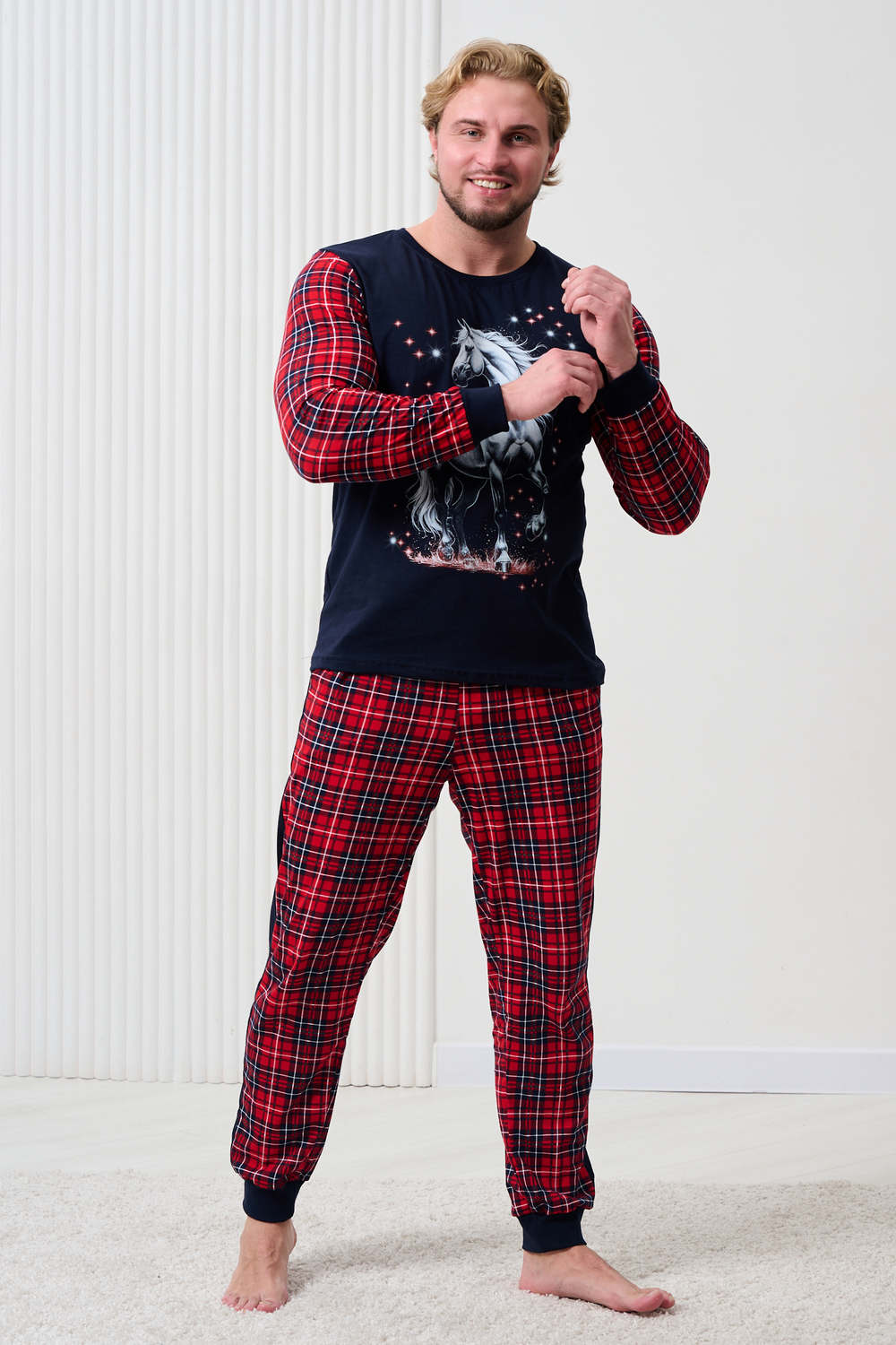 Пижама мужская свободного силуэта состоит из кофты и брюк. На полочке принт. Брюки на манжете. В боковых швах карманы.