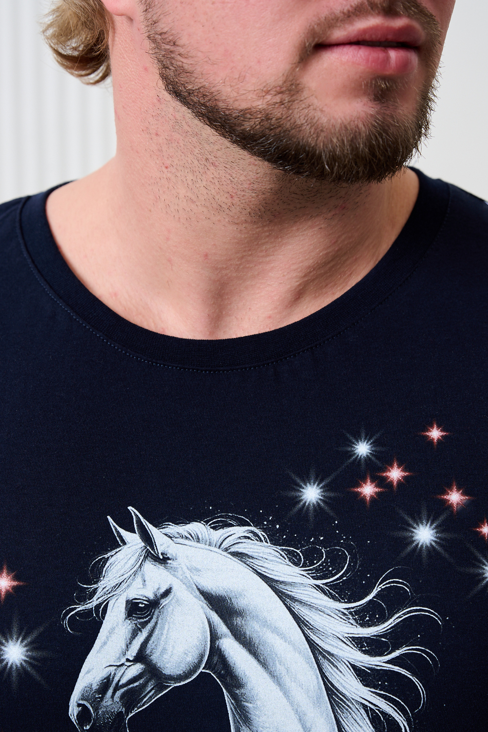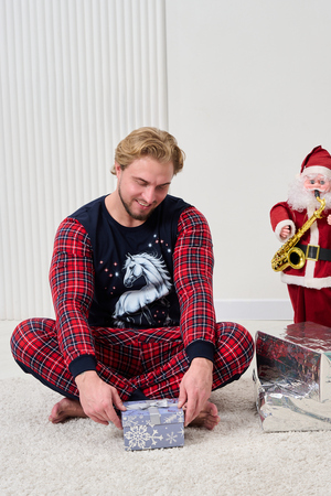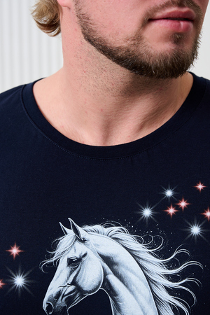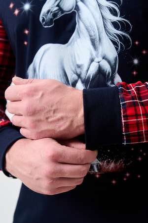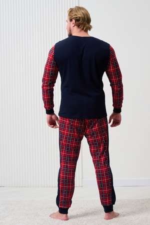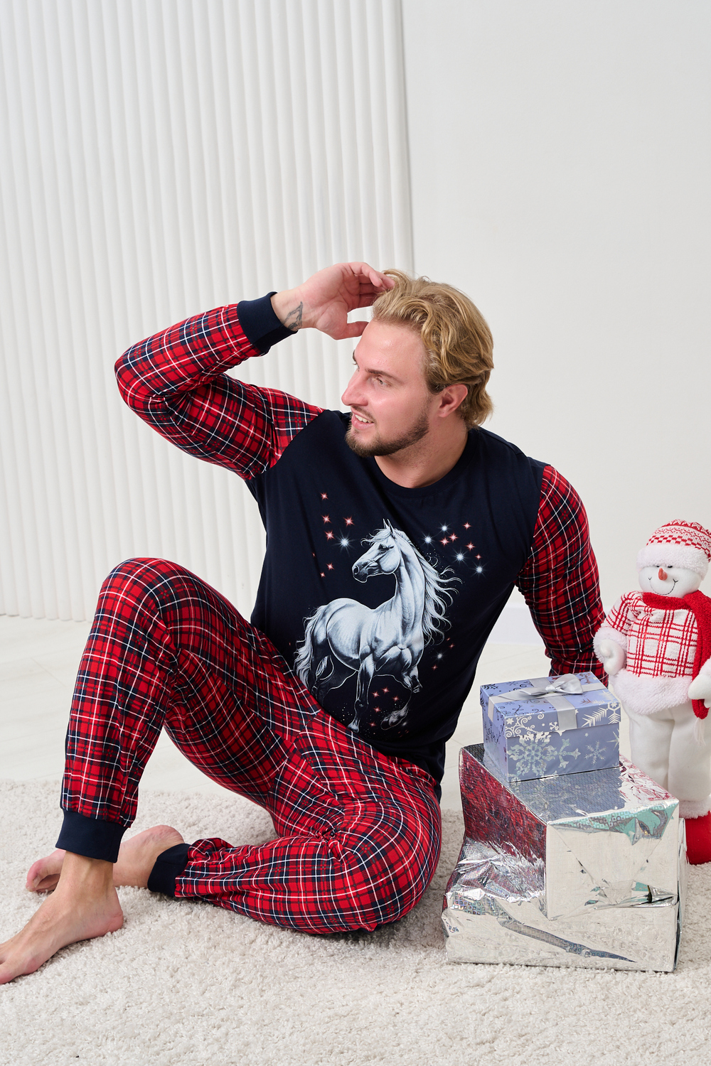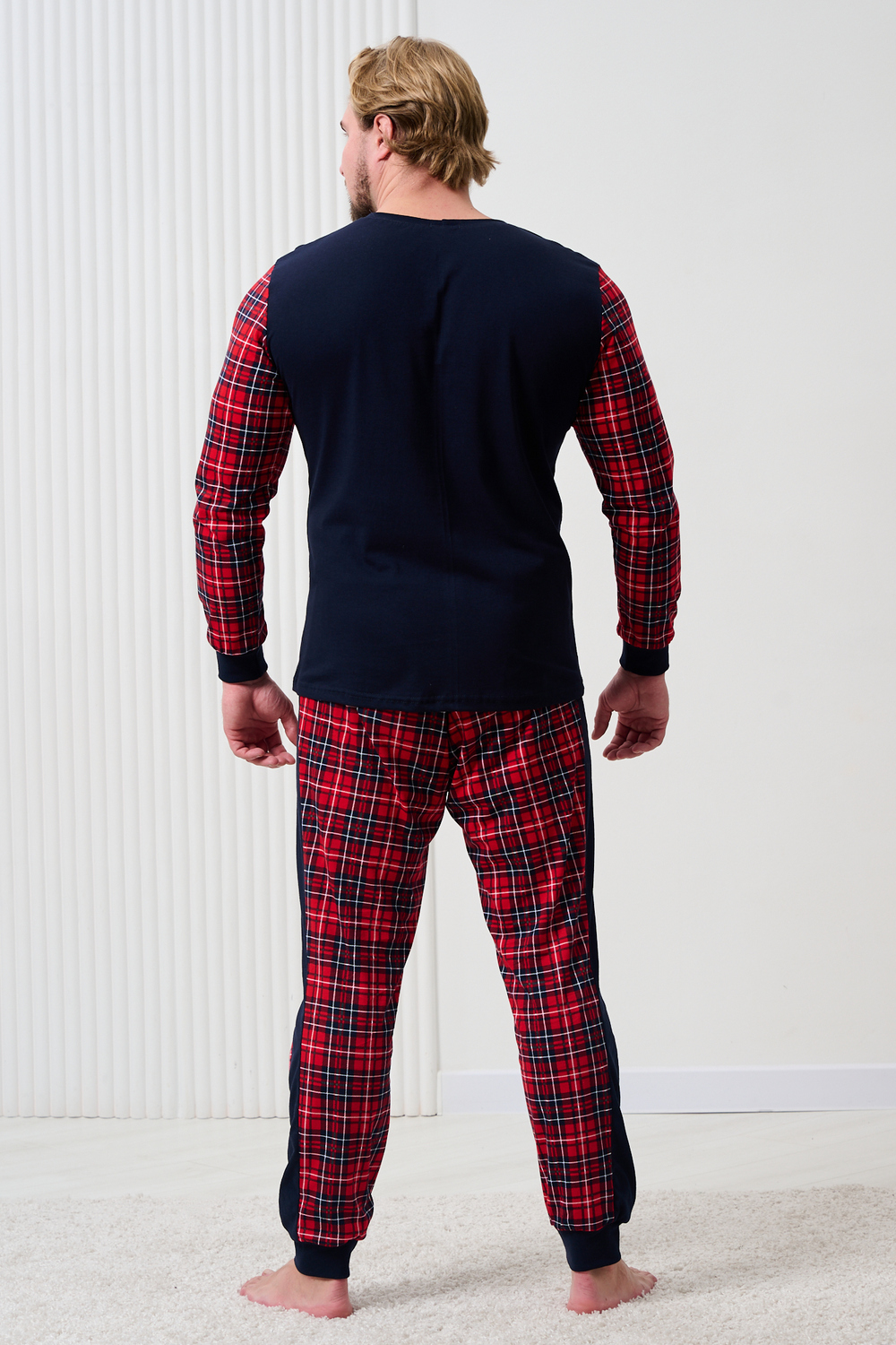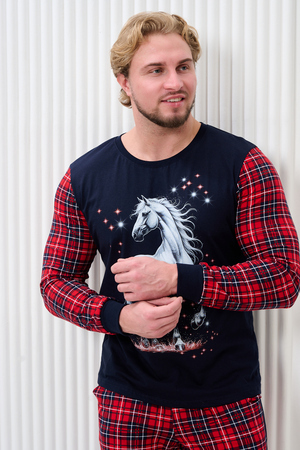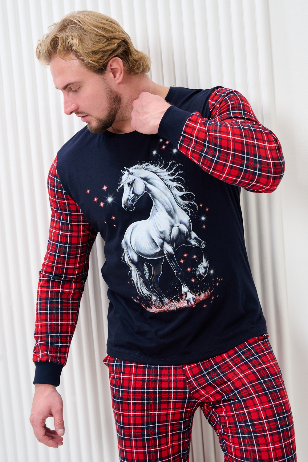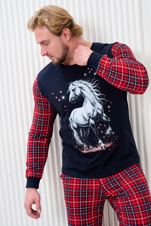 Пижама мужская свободного силуэта состоит из кофты и брюк. На полочке принт. Брюки на манжете. В боковых швах карманы.