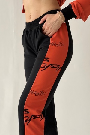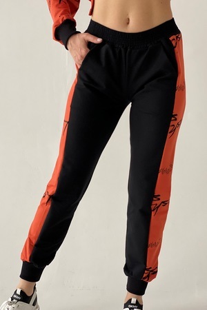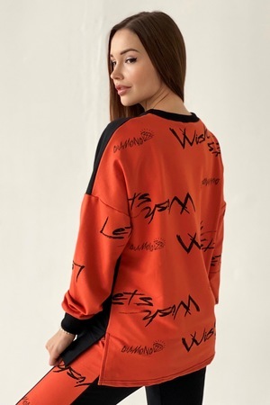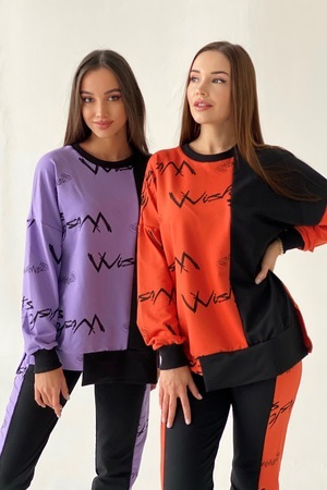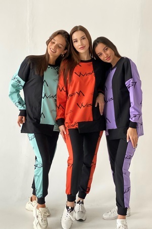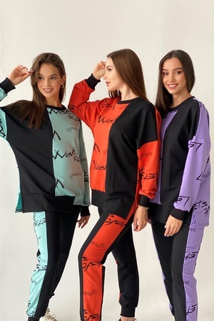 Комплект состоит из свитшота и брюк. Брюки полуприлегающие, на эластичном поясе, с карманами, на эластичном манжете по низу. Вдоль боковых швов расположен лампас из отделочного полотна. Свитшот свободный, с фигурным низом спереди. В нижней части боковых швов обработаны разрезы. Рукав длинный, на эластичном манжете. Горловина округлая, обработана эластичной обтачкой.