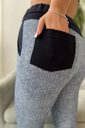 Брюки прилегающие, длина 7/8, внизу цельнокроенная манжета. Пояс, бочки, задние накладные карманы и кокетка из отделочной ткани.