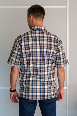 Мужская рубашка в клетку с коротким рукавом. Ткань шотландка 100% хлопок. Модель свободного кроя, дополнена двумя накладными карманами и клапанами с пуговицей. Планка на полочке цельнокроеная, застегивается на пуговицы. Плечо приспущено, рукав с цельнокроеной планкой. Воротник на стойке, проложен флизелином с отстрочкой. Низ изделия застрачивается швом вподгибку при помощи специального приспособления. Внимание! Данный товар по цвету не подбирается.