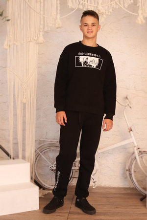 Костюм из тёплого футера с начёсом для мальчиков и девочек. Толстовка выполнена без капюшона и кармана, поэтому её очень удобно надевать под любую куртку. Брюки с поясом на резинке с дополнительной регулировкой шнуром. Низ толстовки, брюк и рукавов с эластичными манжетами из кашкорсе. Полочка и рукава, брюки декорированы одноцветной печатью, которая делает образ эксклюзивным не перегружая его цветовыми решениями. Костюм в лаконичном образе по стилю, комфортный по крою, тёплый по ощущениям просто незаменим в осенне-весеннем и зимнем сезонах.