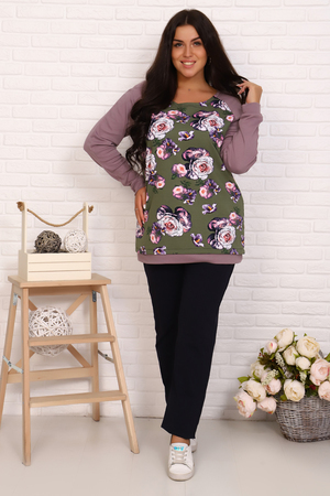 Туника женская, полочка и спинка из набивного футера двух нитки. Рукав реглан однотонный из интерлока качества пенье. Для дома и отдыха.