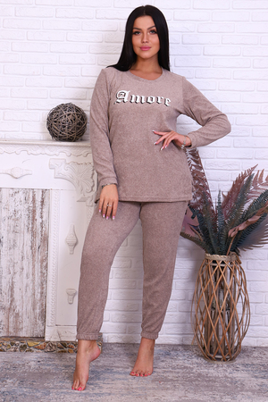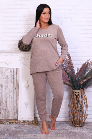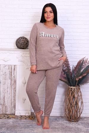 Костюм домашний свободного кроя. Кофта с втачным рукавом полной длинны с манжетом. На груди находится печать. Спинка чуть длиннее переда, в боковых швах разрезы. Брюки с карманами, пояс и низ брюк на резинке.
