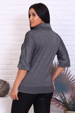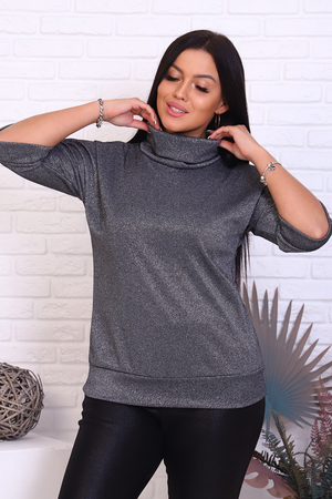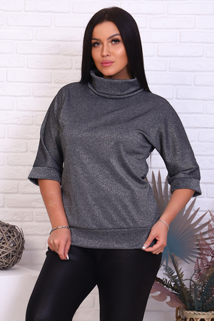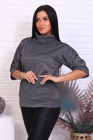Cтильная туника свободного кроя с рукавом "летучая мышь", по низу рукав оформлен манжетой. Очень комфортная, идеально садится на большую грудь, стройнит и скрывает проблемные зоны. Рукав 3/4, воротник хомут. Туника из ткани с люрексной нитью, что придает изделию праздничный вид. Прекрасный вариант для создания эффектных образов в сочетании с брюками и юбками.