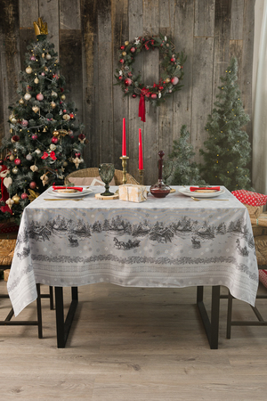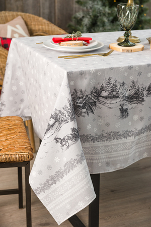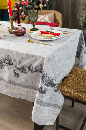 Светлая серая скатерть с изображением оленей и зимних узоров отлично подойдет к любому интерьеру кухни. Размер 220*150 позволит собрать за столом большую компанию.