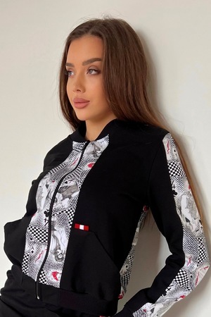 Костюм женский из кофты и юбки. Кофта на молнии с двумя карманами. Спереди на юбке шлица, сзади кармашек с флажком.