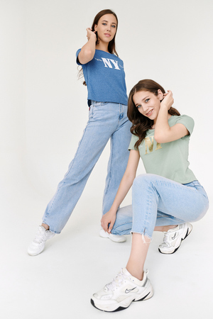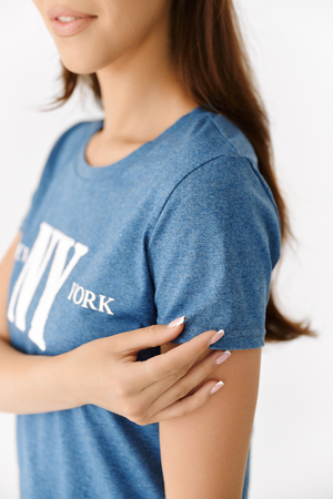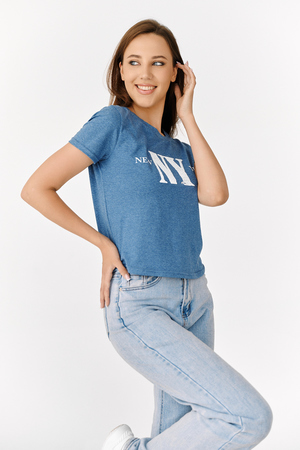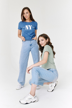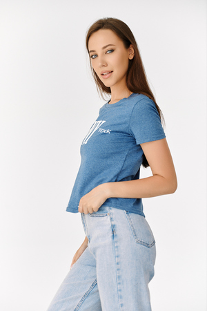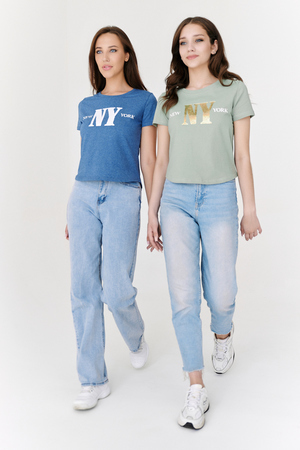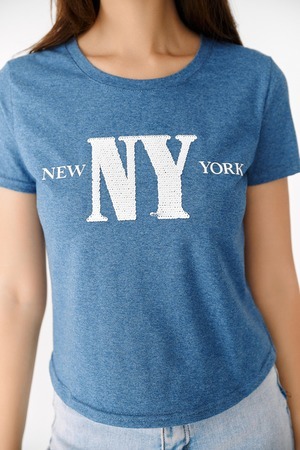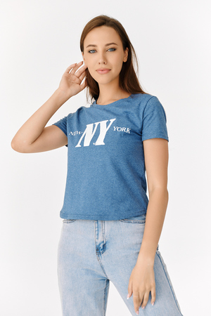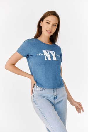 Футболка прямого силуэта, с фигурной линией низа, с округлой горловиной. Рукав втачной, короткий. Горловина обработана обтачкой из основного полотна. На полочке эффектно сочетаются аппликация из пайеток в виде букв NY и печать New York