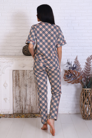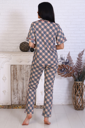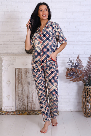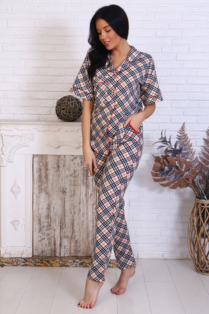 Женский пижамный костюм состоит из рубашки и брюк. В этом ансамбле вы найдете все - трендовая расцветка, идеальная посадка, широкий размерный ряд. Прекрасный вариант для подарка. Рубашка свободного покроя застегивается на 5 пуговиц, на груди накладной карман. Брюки прямого покроя с карманами по бокам. На срезах изделие отстрочено контрастным кантом, что придает образу шик и элегантность. Выглядеть прекрасно дома - это просто
