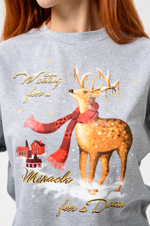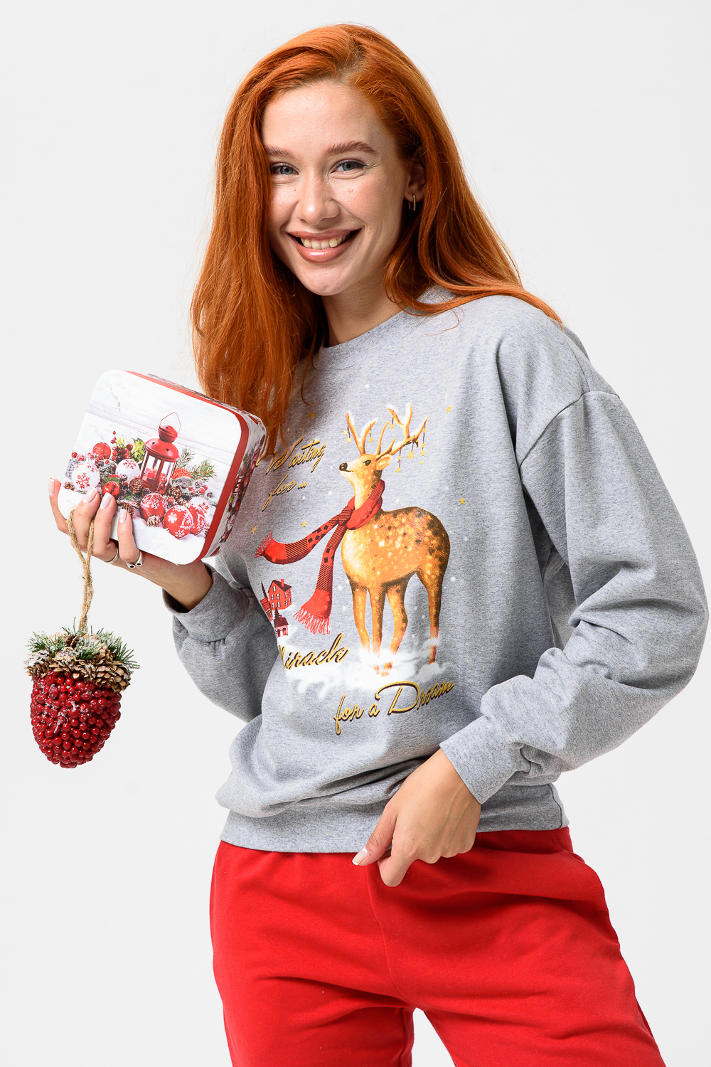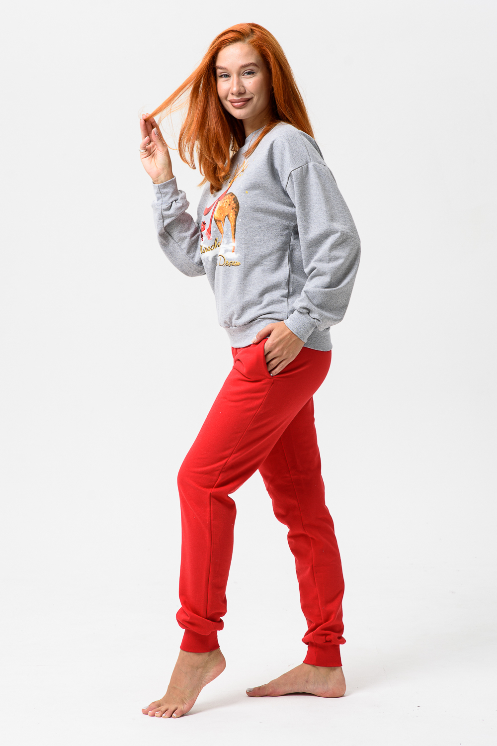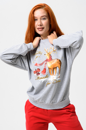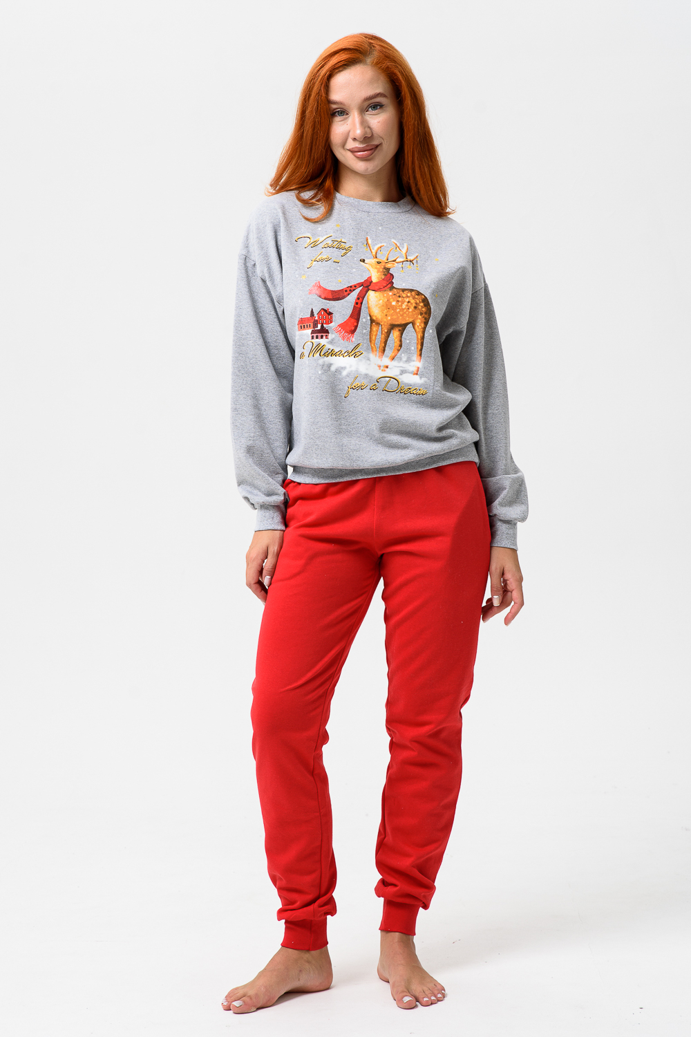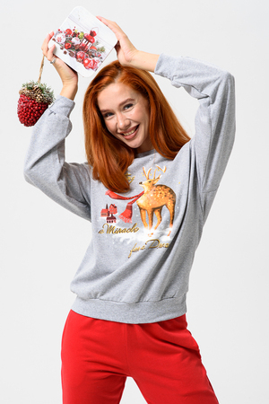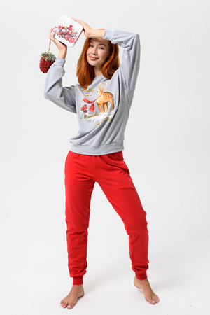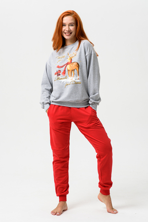 Олени - неотъемлемый атрибут Рождества. Традиция использовать в новогоднем убранстве рождественских оленей завоевала большую популярность во всём мире. В этом уютном удобном костюме из футера 2х нитки с начёсом комфортно находиться в домашней обстановке. В нём можно встретить праздник и использовать в качестве подарка. Костюм состоит из свитшота свободного кроя и брючек с карманами в боковых швах. Все манжеты на костюме выполнены из плотной резинки - кашкорсе. Пояс обработан плотной резинкой 3см. После стирки может быть небольшая усадка, поэтому имеется напуск. Длина рукава в измерениях указана от основания шеи.