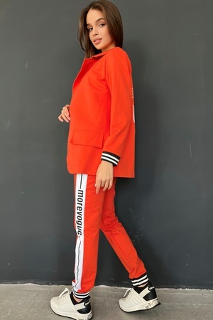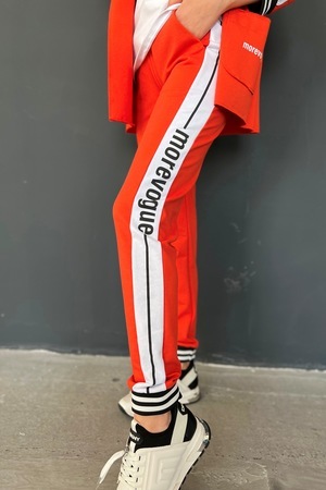 Брюки на поясе, с боковыми и задними карманами, на манжете по низу. Вдоль боковых швов расположены лампасы из отделочного полотна. Можно составить комплект с жакетом 8186; продается отдельно