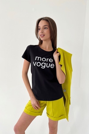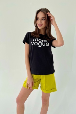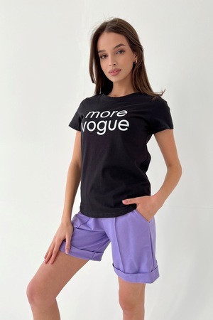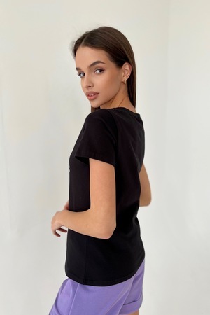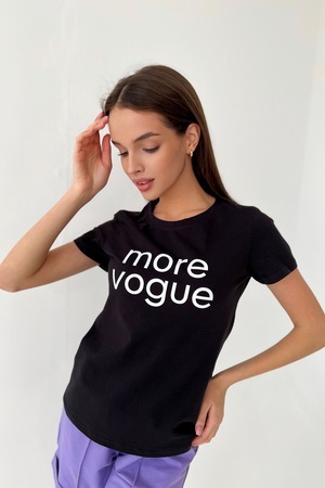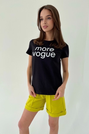 Футболка прямого силуэта, с округлой горловиной, длиной до середины бедра. Рукав втачной, короткий. Горловина обработана обтачкой из основного полотна.