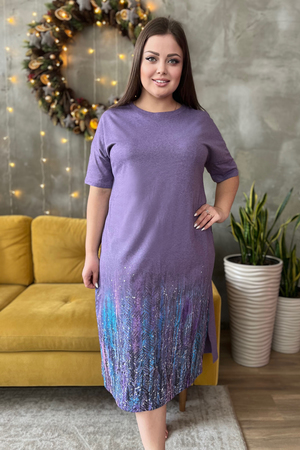 Платье прямого силуэта, с округлой горловиной, с разрезами в нижней части боковых швов. Рукав короткий. Горловина обработана обтачкой из основного полотна. На модели 52 размер