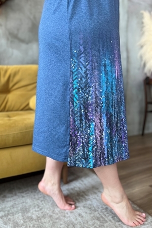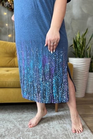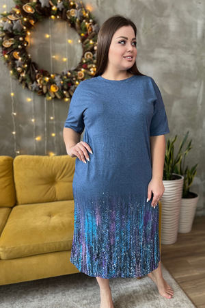 Платье прямого силуэта, с округлой горловиной, с разрезами в нижней части боковых швов. Рукав короткий. Горловина обработана обтачкой из основного полотна. На модели 52 размер