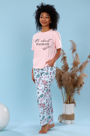 Пижама женская комбинированная футболка с брюками. Данная модель выполнена из трикотажного полотна кулирка (хлопок 100%). Футболка свободного кроя со спущенным коротким рукавом, на полочке наложен принт. Брюки длинные свободные с поясом и карманами по бокам. Отлично подходит для дома и отдыха.