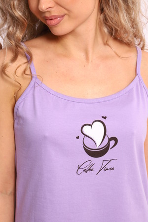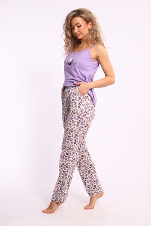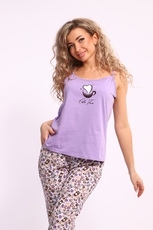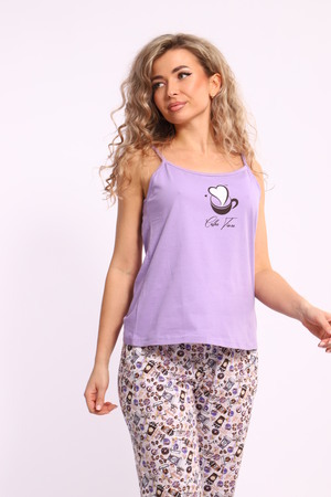 Костюм женский с брюками. Данная модель выполнена из трикотажного полотна кулирка (хлопок 100%). Майка на тонких бретелях, на полочке присутствует принт. Брюки свободного покроя с боковыми карманами и вшивным поясом. Отличная модель для домашнего отдыха.