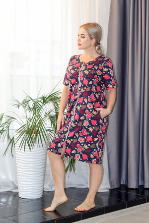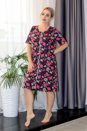 Халат на молнии полуприлегающего силуэта с короткими рукавами и карманами в боковых швах.