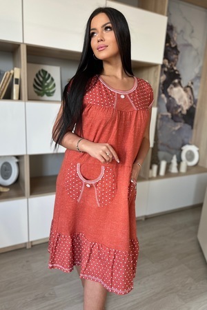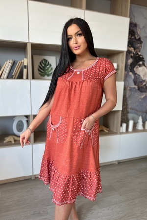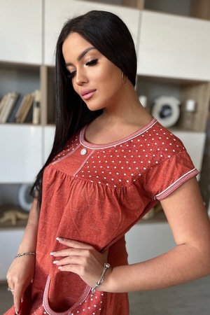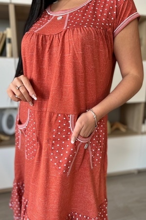 Платье женское прямого силуэта, слегка расширенное к низу. Рукав цельнокроенный короткий. Кокетка полочки, карманы и широкая рюша по низу изделия из отделочной ткани в мелкий горошек. В верхней части платья небольшая сборка для комфортной свободы по груди изделия. На средней части кокетки и карманов по одной декоративной пуговице. По горловине изделия, входу в карман и низу рукава двойная окантовка с белым кантом.