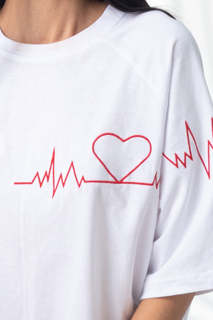 Вышивка в виде кардиограммы станет незабываемым акцентом в вашем образе. Футболка изготовлена из 100% хлопкового трикотажа оптимальной плотности. Рукав реглан добавит дополнительный комфорт в носке изделия.