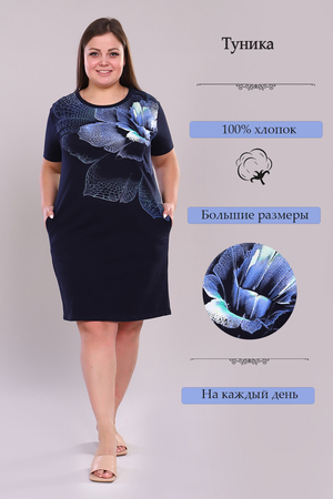 Туника женская из кулирного полотна, прямого кроя, горловина круглая, рукав короткий, в боковых швах внутренние карманы, на полочке принт. Изделие легкое в уходе. Туника прекрасно подойдет для дома, дачи, прогулок. На модели 52 размер