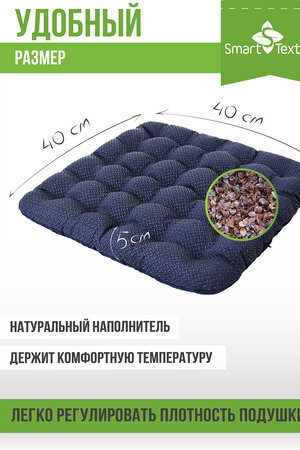 Подушка на стул или кресло «Уют-Премиум» наполнена лепестками лузги гречихи, которые придают ей анатомические свойства и способность подстраиваться под контуры тела, равномерно распределяя нагрузку и снижая напряжение в мышцах.