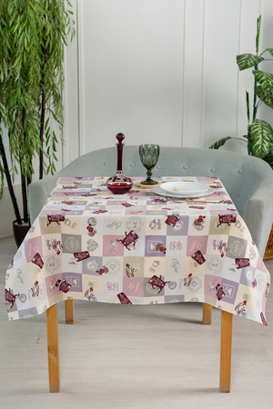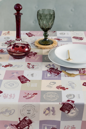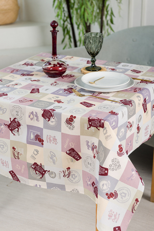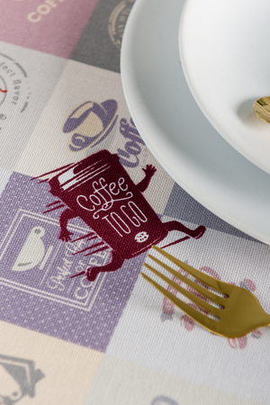 Стильная скатерть с изображением забавных кофейных стаканчиков поможет взбодриться даже утром понедельника. Материалом для изделия послужила износоустойчивая рогожка.