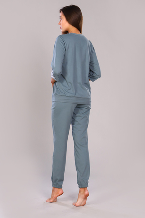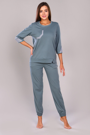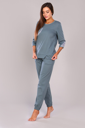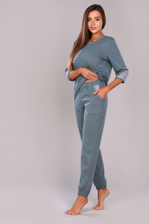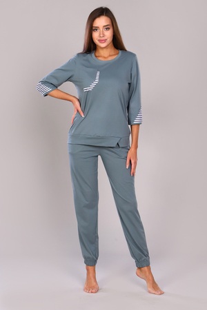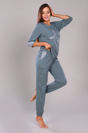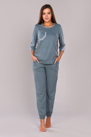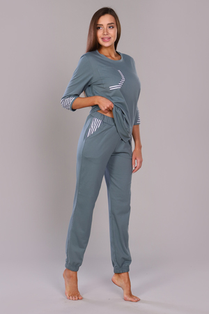 Молодежный костюм из кулирки футболка + брюки. Футболка чуть свободная, спереди двойной карман, рукава 3/4 с отделкой, горловина круглая, внизу пояс, брюки-джоггеры с карманами, снизу на резинках