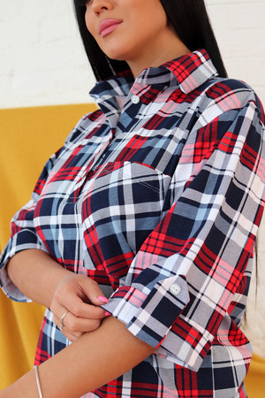 Туника клетка выполнена из ткани кулирки хлопок 100%. На полочке планка с пуговицами, карман, воротник рубашечный со стойкой, рукава на манжете с патой. Внизу легкое закругление, по бокам разрезы, на спинке кокетка. Туника подойдет для отдыха, дома и прогулок.
