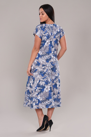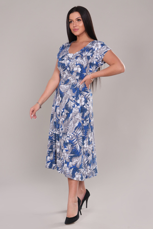 Платье женское удлиненное со спущенным рукавом, на полочке подрез, планка  на трех декоративных  пуговицах, внизу расклешение. Рисунок ткани красивый, насыщенный. Модель придает легкость, изящность, подойдет на каждый день, для прогулки и дома.
